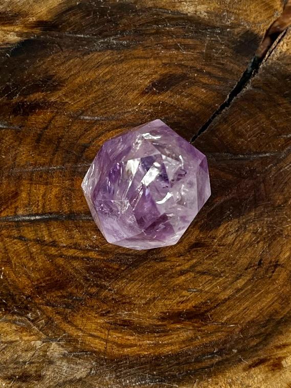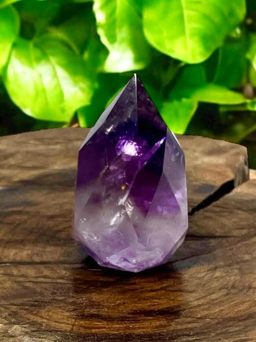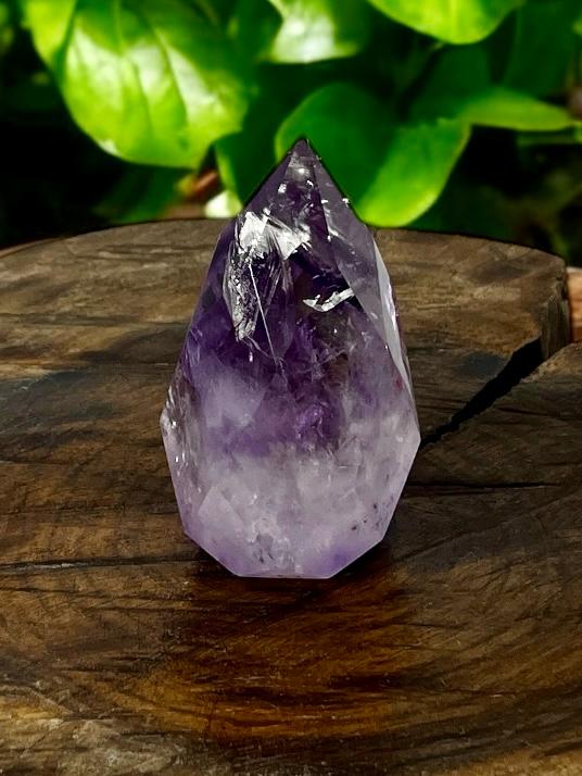 A Gota Facetada de Ametista é um cristal lapidado em formato de gota, com múltiplas facetas que intensificam seu brilho e realçam os tons roxos da pedra.